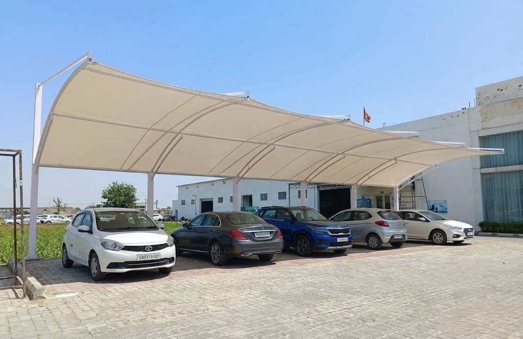 Tensile car parking shade structures designed to protect vehicles from sun, rain and UV exposure. Suitable for residential societies, commercial buildings and showroom parking areas.